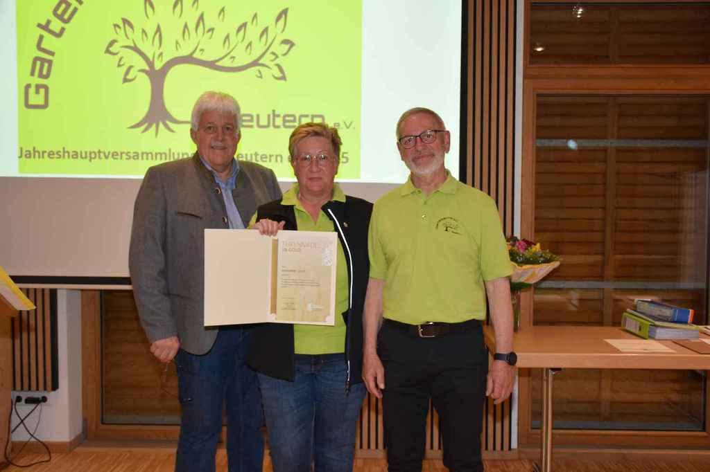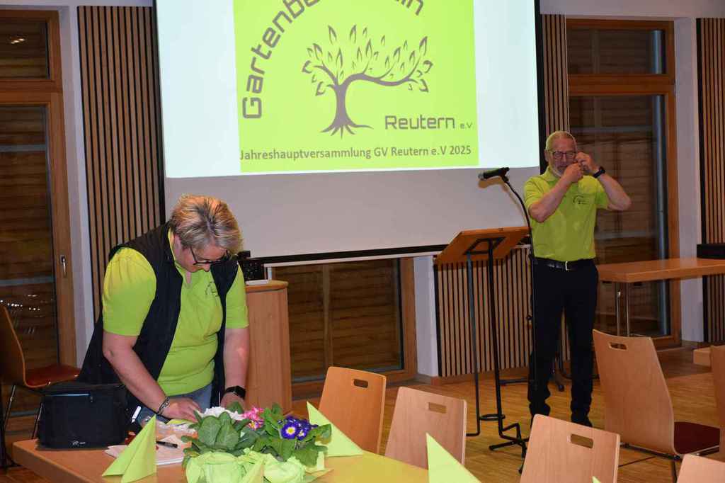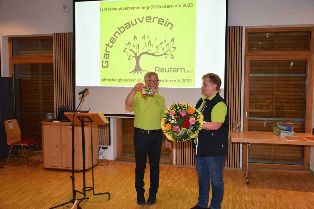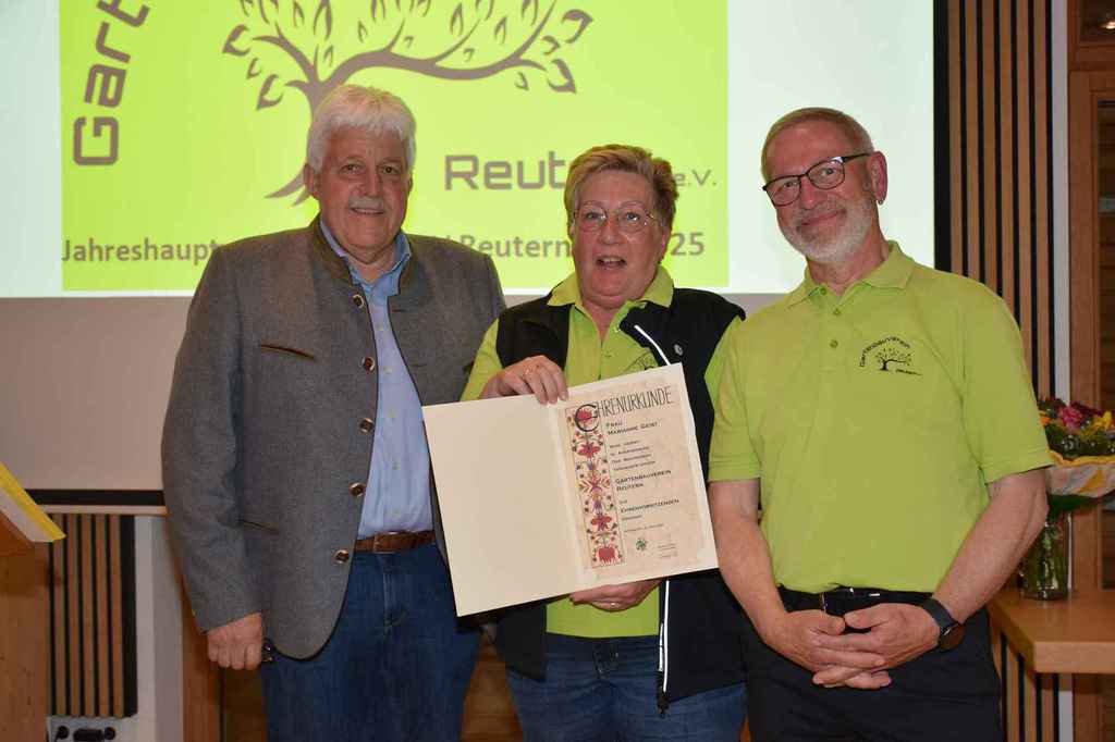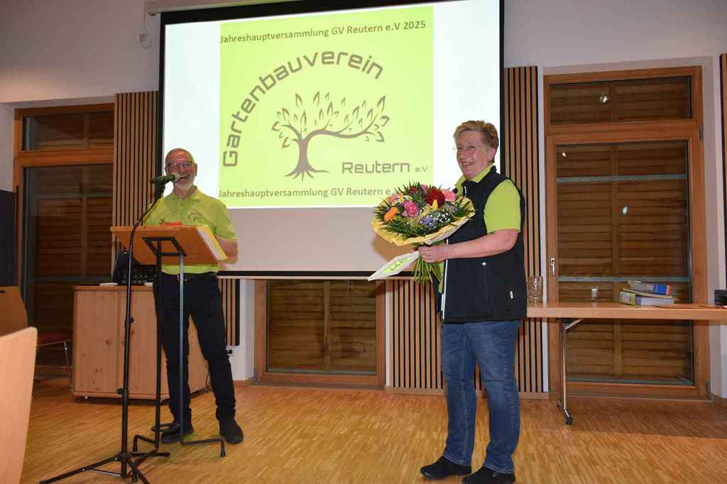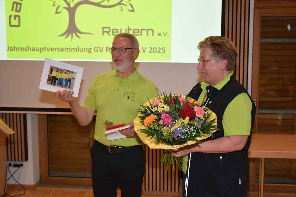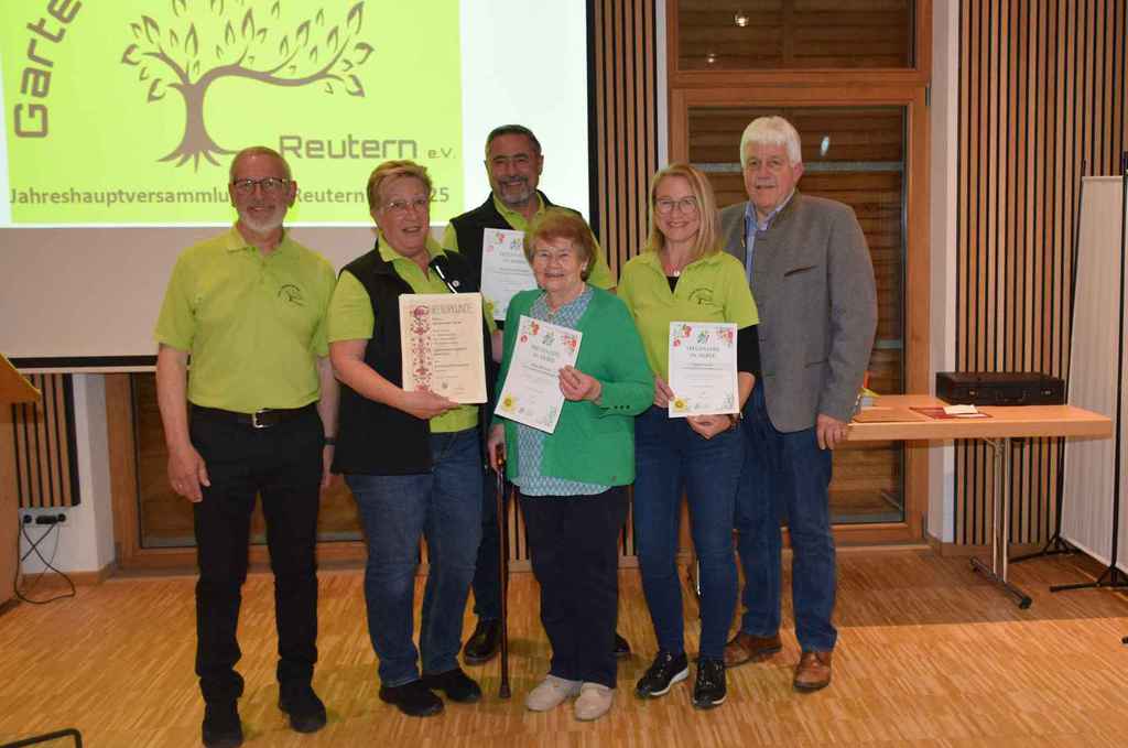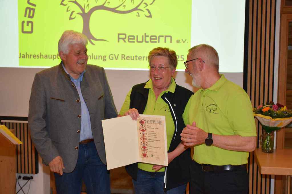 mit der Begrüßung der Ehrenmitglieder, den Wahlleiter Walter Karlstetter und die Vertretung vom Verband Josef Hirschenauer. Bei einer Gedenkminute für die verstorbenen Mitgliedern wurde besonders den verstorbenen Mitgliedern aus 2024 (Walter Henghuber, Horst Frischat und Franz Maier gedacht. Die Aktivitätenliste vom abgelaufenen Jahr zeigte die zentrale Funktion des Vereines im Dorfleben auf. Der Einblick auf die aktuelle Aktivitätenliste verspricht wieder ein spannendes Vereinsleben. Die vor 3 Jahren gegründete Gartenzwergalgruppe bekommt Zuwachs mit einer weiteren Gruppe, die den Namen Knollenbande tragen wird. Die Aktivitäten der Zwergalgruppe erörterte Diana Winklhofer. Die Leitung der neuen Knollenbande übernehmen Melanie Bromberger und Manuela Petzi. Anita Neubauer wies eine ausgeglichene Kasse aus, die durch die Kassenprüfer Rosa Danner und Arnold Pöschl bestätigt wurde. Die Wahlleiter Walter Karlstetter und Kathrin Schwarz wurden von der Versammlung bestätigt und walteten des Amtes. Alle Ämter wurden einstimmig beschlossen und von den gewählten dankend angenommen. Neu besetzt wurde der 1 Vorsitz von Wolfgang Petzi sowie der 2 Vorsitz von Martina Stirner;1 Kassier Anita Neubauer; 1 Schriftführer Hans Schwarzbauer; Beisitzer Maria Hinterdobler, Anita Hirsch, Lena Wagner, Sigrid Pöschl und die Kassenprüfer Rosa Danner, Arnold Pöschl wurden im Amt bestätigt. Als neue Beisitzer wurden Petra Weindl und Herbert Köckerandl gewählt. Der neu gewählte 1 Vorsitzende Wolfgang Petzi verabschiedete Marianne Geist mit rührenden Worten, Präsenten und der Ernennung zurEhrenvorsitzenden. Sichtlich gerührt von den Worten von Wolfgang und der gelungenen Überraschung (Gesangseinlage zur Verabschiedungvon Marianne mit dem Lied Siahamba) unter nachfolgenden Standing Ovation, machte Marianne sprachlos. Mit freudigen Worten dankte Marianne der Vorstandschaft für die tolle Teamarbeit und den Anwesenden für die große Wertschätzung ihrer Arbeit. Josef Hirschenauer überbrachte die Grüße vom Verband und referierte über die Aufgaben des Verbandes und merkte an, dass sich der GV Reutern glücklich schätzen kann, so eine aktive Vorstandschaft zu haben und es an Nachwuchs nicht fehlt. Bei den 59 Vereinen, die im Kreisverband gelistet seinen, sähe das Bild zumeist anders aus. Wolfgang Petzi und Josef Hirschenauer überreichten Rosa Wimmer für 25 Jahre Mitgliedschaft die Ehrennadel in Silber mit Urkunde. Sigrid Pöschl und Hans Schwarzbauer wurden für 15 Jahre Vorstandsarbeit mit der silbernen Ehrennadel und Urkunde geehrt. Ein weiteres Highlight für Marianne war die Ehrung für 25 Jahre Vorstandsarbeit. Die besondere Ehrung wird mit der Ehrennadel in Gold vom Verband mit Urkunde gewürdigt. Ein emotionaler Abend für die scheidende 1 Vorsitzende Marianne und ein gelungener