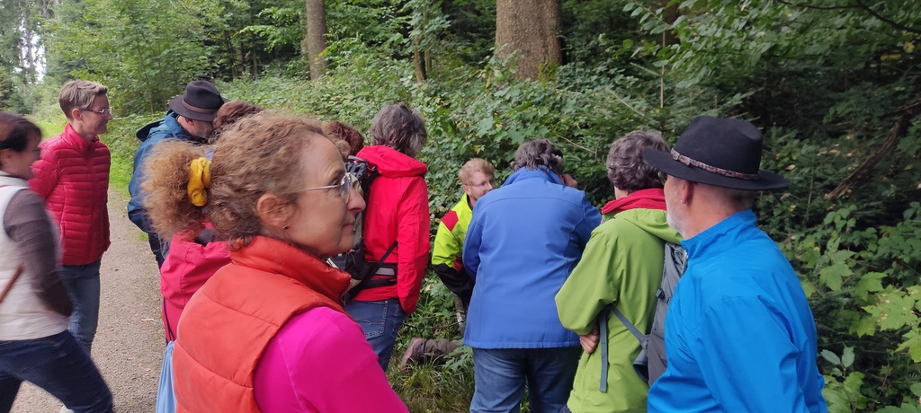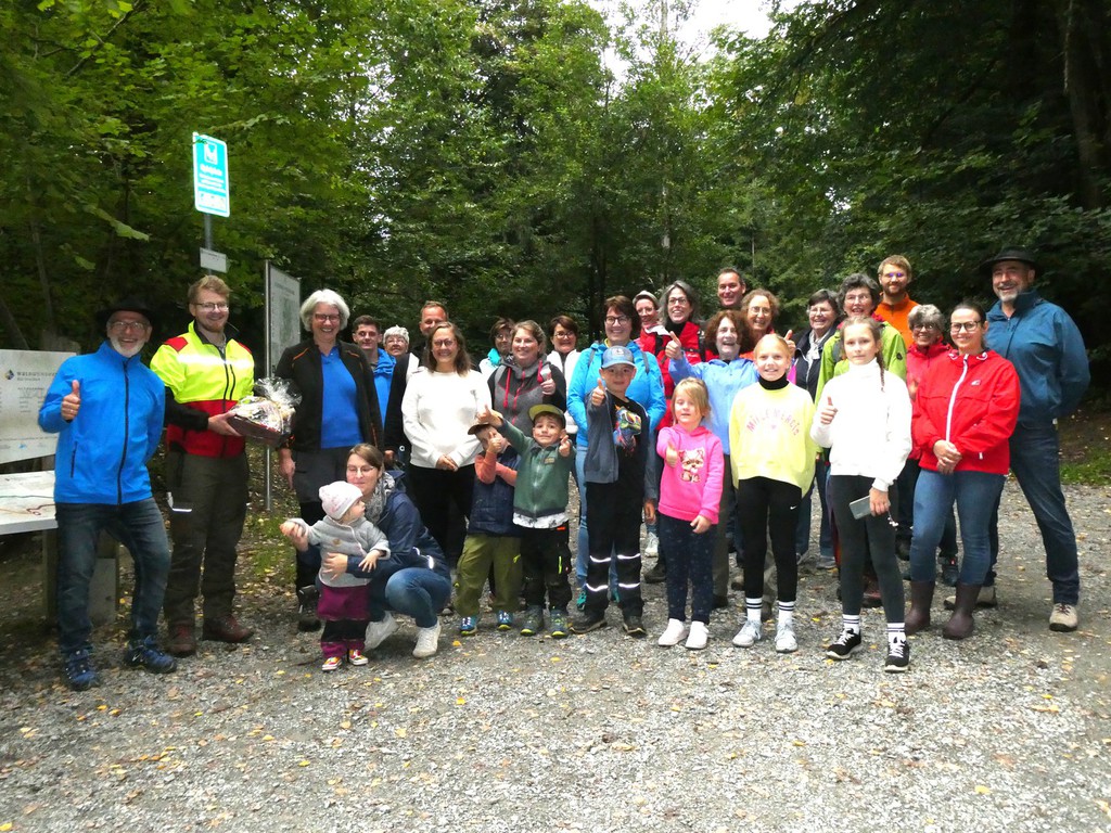 Wann ist ein Wald ein Wald. Das wäre dann ein erkennbares Ökosystem mit einem Mindestdurchmesser eines ausgewachsenen Baumes im Habitat. Eine weitere wichtige Frage vom Förster an die Teilnehmer war, was sie mit dem Begriff Wald verbinden. Die Antworten waren breit gefächert und reichten von der Erholung bis hin zur reinen wirtschaftlichen Betrachtung. Bodengüte, Borkenkäfer, Schadpilze, Trockenheitsresistenz, natürliche Samenverteilungsmethoden und vieles mehr fehlte nicht, was den geplanten zeitlichen Rahmen deutlich strapazierte. Mit einem kleinen, mit regionalen Produkten gefüllten Präsentkorb bedankten sich die Organisatorin Maria und der Vorsitzende Wolfgang bei den beiden Förstern.