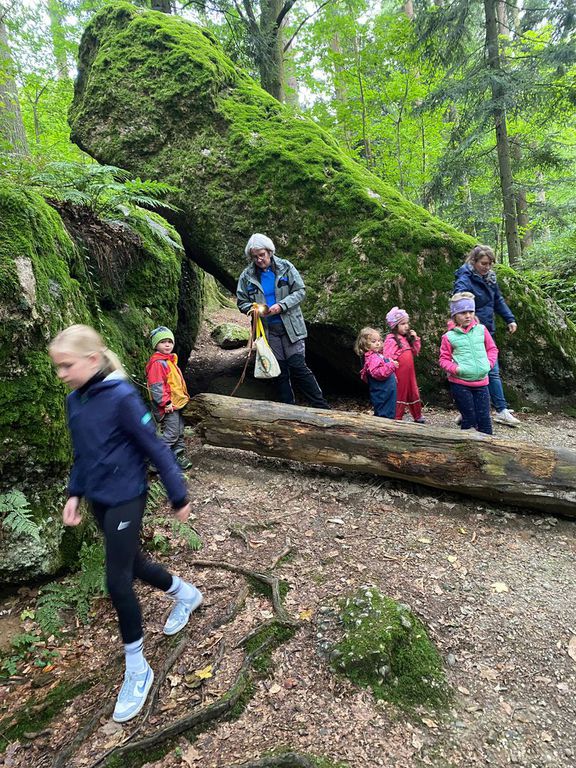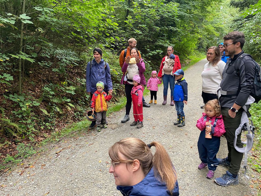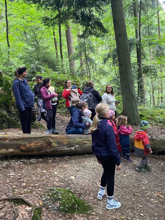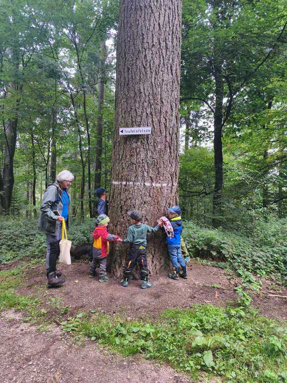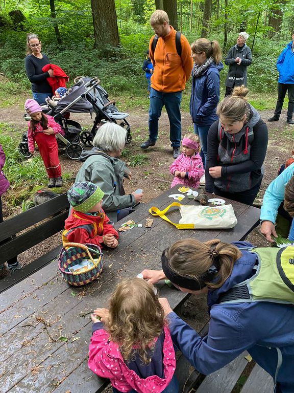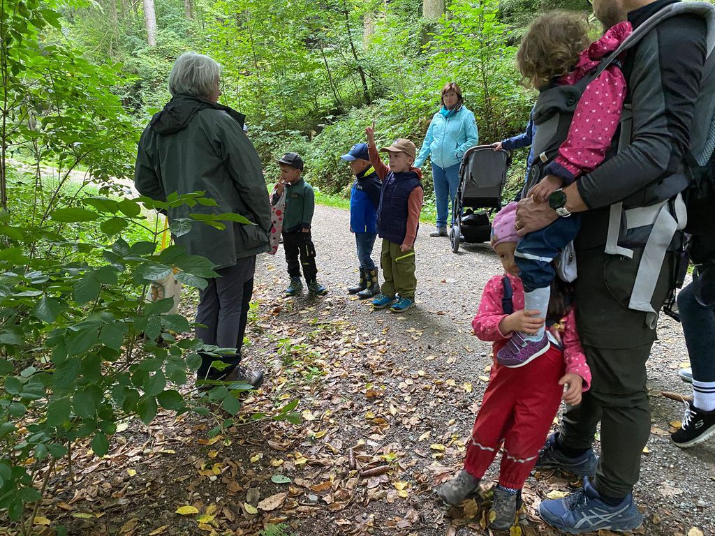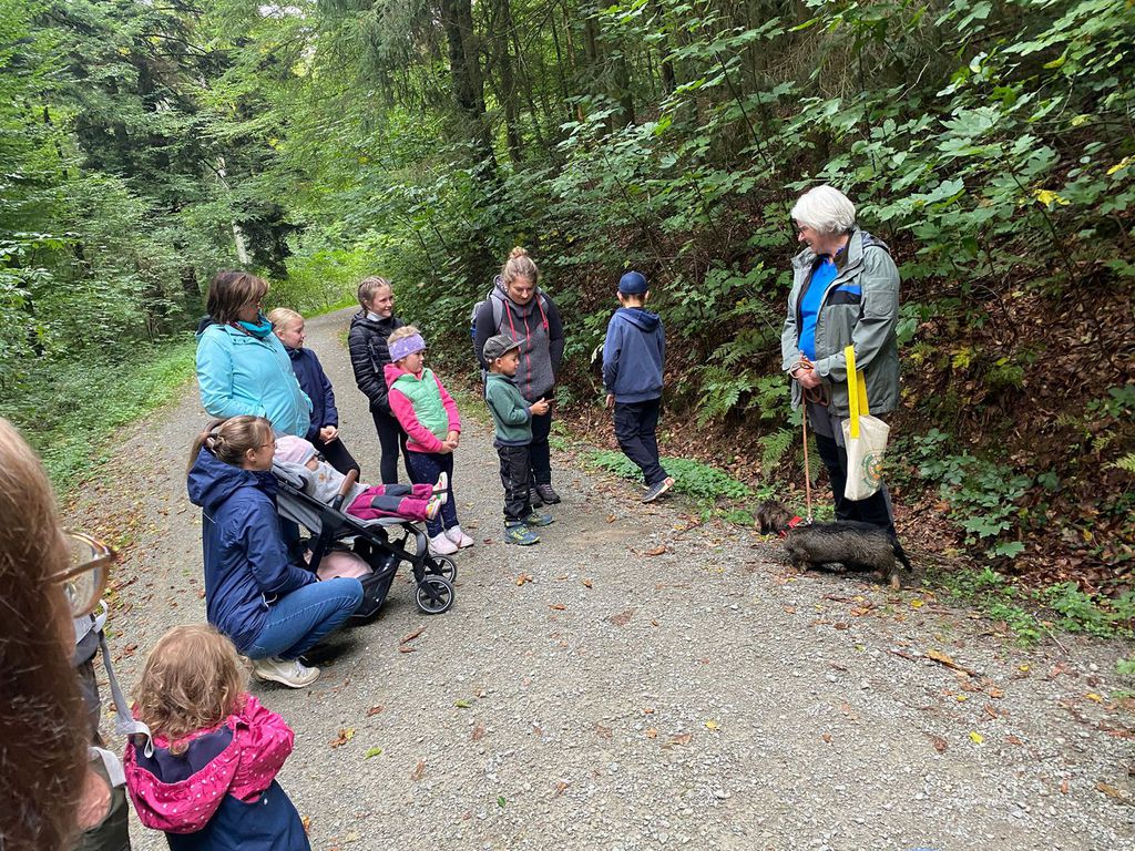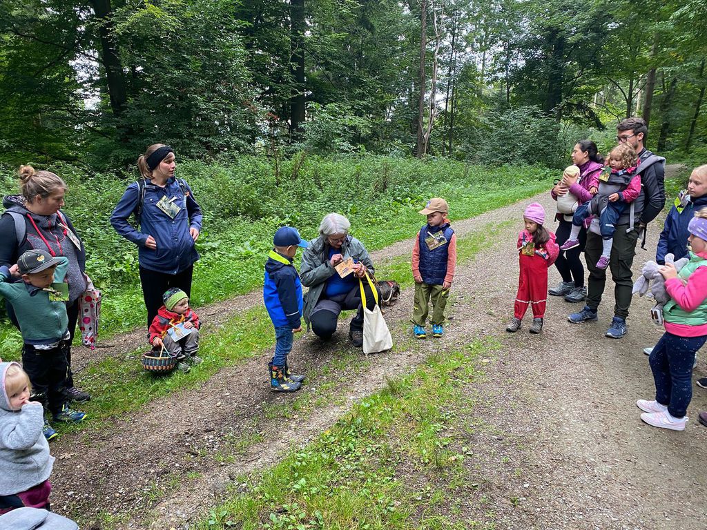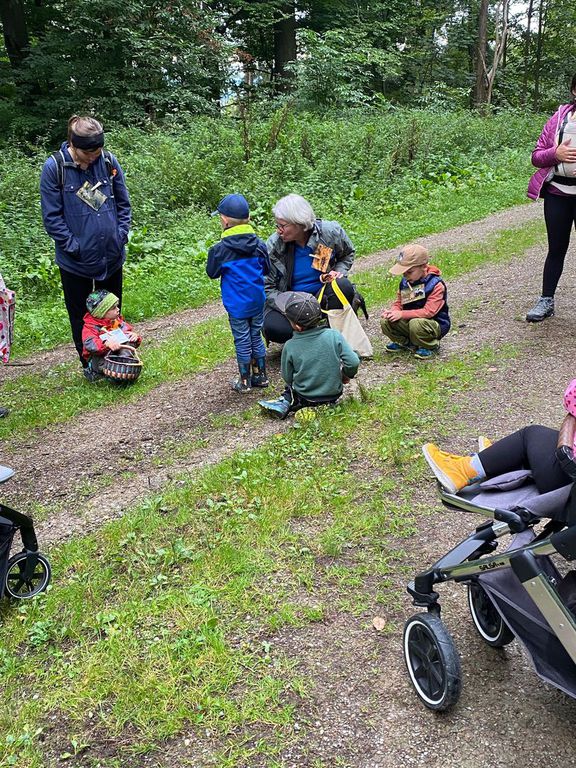 Knollenbande und die Zwergalgruppe mit ihren Müttern und Vätern dar. Die Junge Generation startete mit der Försterin Martina vom Kinderspielplatz in die Erkundungsrunde.Spielerisch wurde der Wald vom
