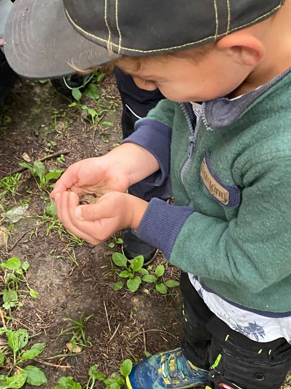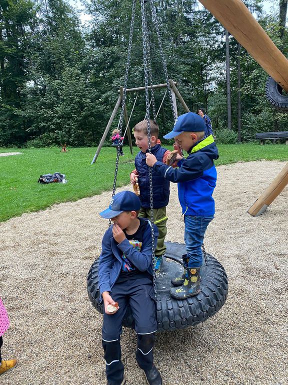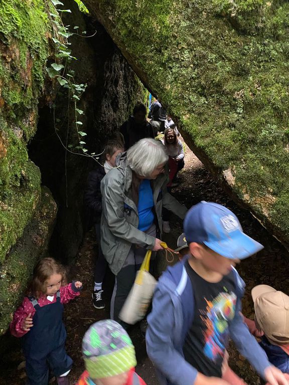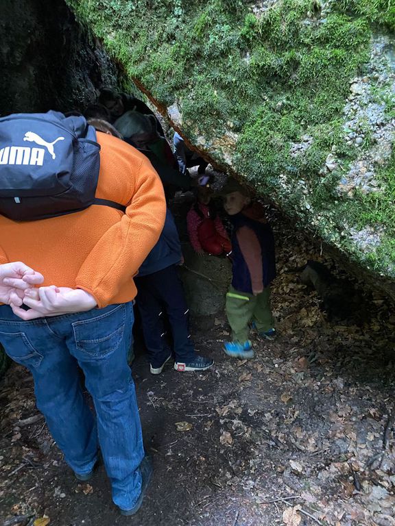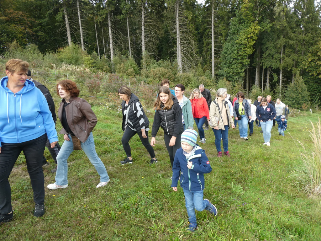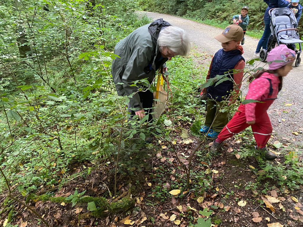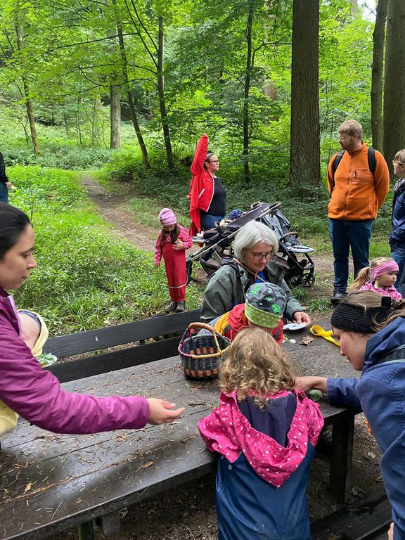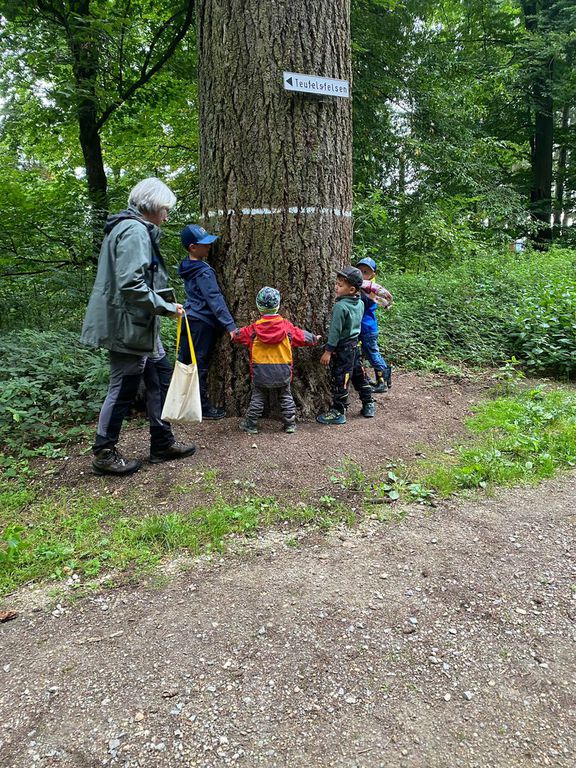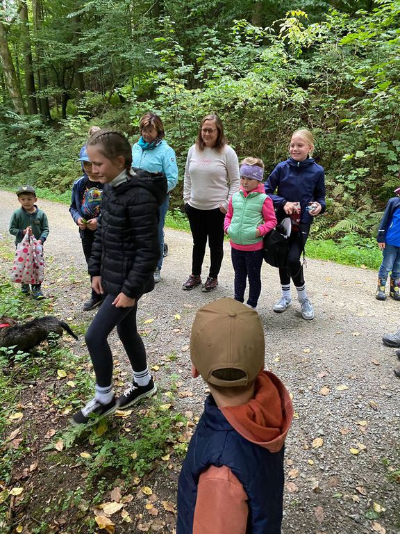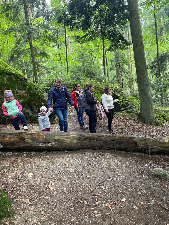 Knollenbande und die Zwergalgruppe mit ihren Müttern und Vätern dar. Die Junge Generation startete mit der Försterin Martina vom Kinderspielplatz in die Erkundungsrunde.Spielerisch wurde der Wald vom