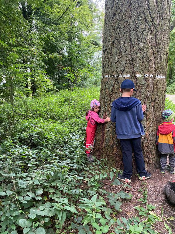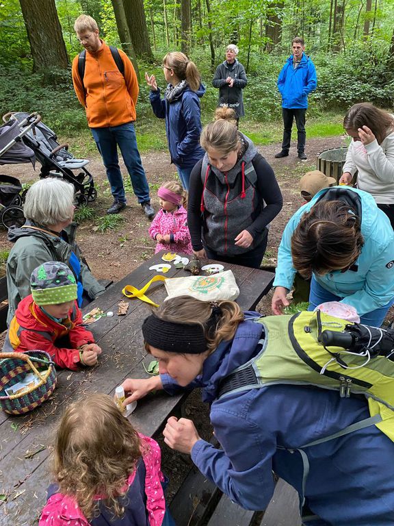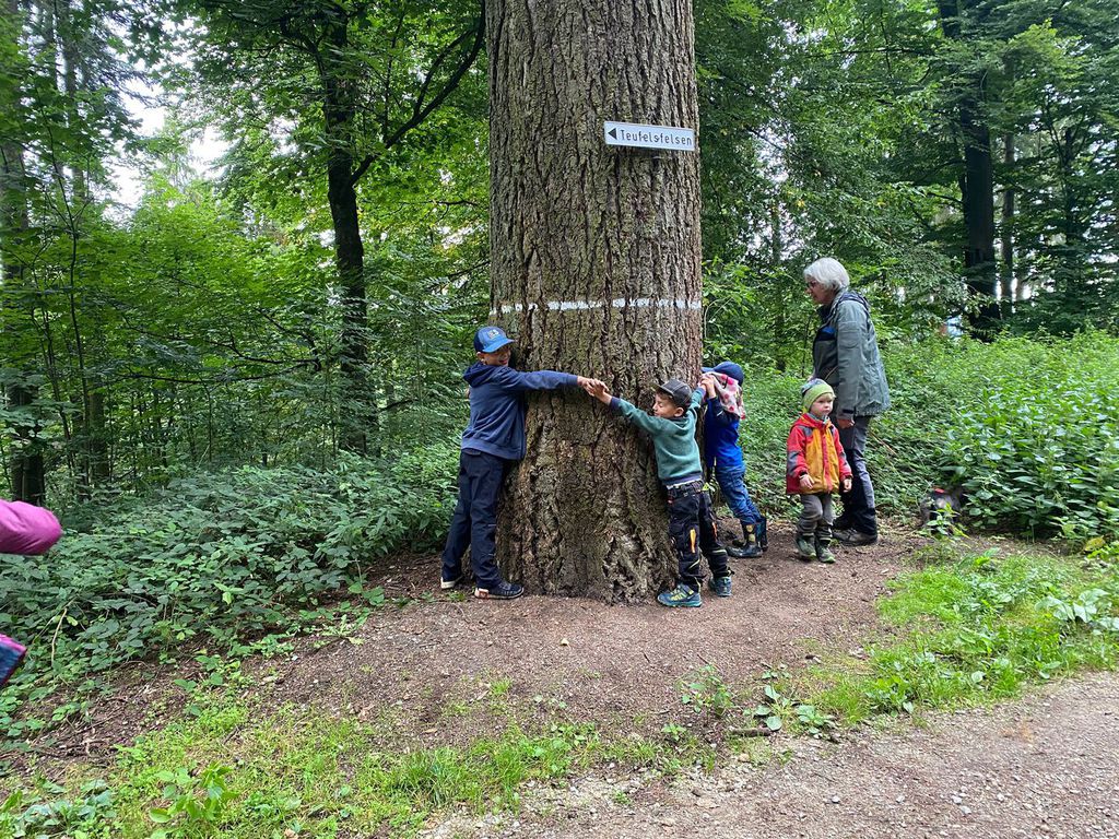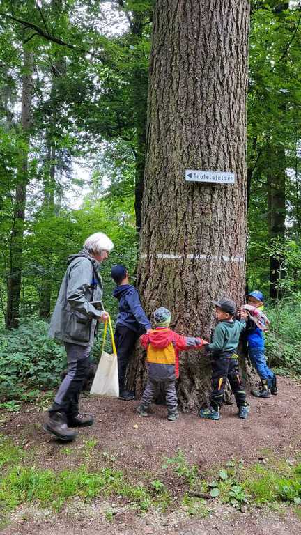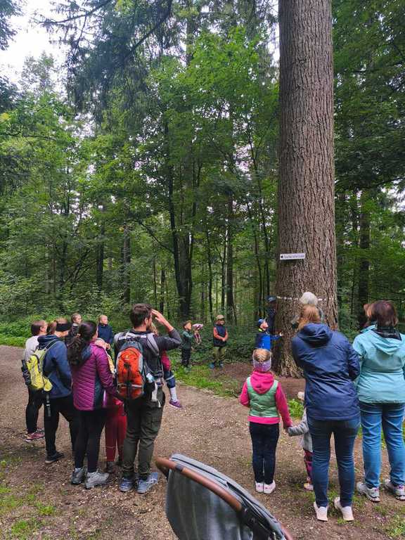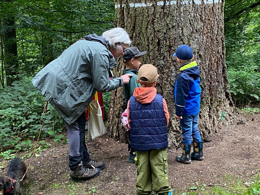 Boden bis zum Baum erkundet. Ein beliebter Punkt ist die majestätisch anmutende alte Kiefer (500 Jahre wird die schon in der Krone haben) an der Wegkreuzung vom Spielplatz in den Rundkurs des Wald Wunder Weges. 7 Kinder mussten ran um den Umfang der Kiefer von Hand zu Hand zu umfassen. Bei der Gruppe vom Förster Matthias ging es Lehrreich in die Runde. Mit dem ersten Halt an der alten Kiefer wurden die Teilnehmer mit Begriffen wie Festmeter, Gewichten, Kohlenstoffanteil und letztlich das gespeichert CO2 Volumen eines Festmeters konfrontiert. Die Schätzungen der Teilnehmer waren da sehr differenziert bei den ca. 25 Festmetern umfassenden Baum. Ebenso erstaunt war man über die Bodenverdichtungen der Holzrücke-verfahren. War man sich doch sicher, dass die Ernte mittels Harvester die schlechteste sein würde. Mathematisch begründet zählt immer das Gewicht das auf 1cm² Bodenfläche einwirkt. Ökologische Waldwirtschaft und das resultierende Ziel, einen gesunden und lebensfähigen Waldbestand zu erzeugen, hatte die Teilnehmer überzeugt, dass der Wald in Deutschland auch weiterhin Bestand hat. Betrachtet wurde der Unterbewuchs bis hin zur Krone. Dabei wurden Blätter von Buche, Eibe, Holler, Fichte, Tanne, Kiefer, Nuss, Kirsche, Kastanie, Eiche, Birke usw. mit ihren Unterscheidungsmerkmalen an vorhandenen Beispielen erörtert. Ebenso wurden die Baumkronenerkennungsmerkmale sowie der wirtschaftliche Aspekt der Nutzung der Baumarten reflektiert. Dann waren da noch diverse Fragen: Wieviel Regen muss fallen damit der Boden was sieht. Erstaunliche 10 Liter pro Quadratmeter.
