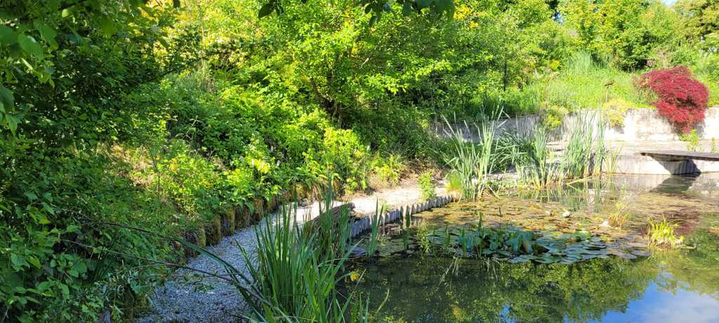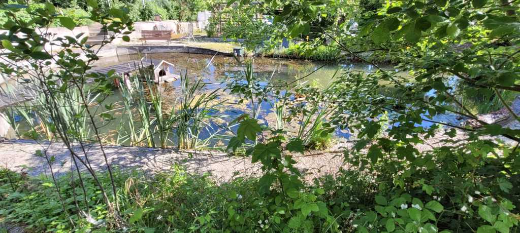Die zweite Runde startete mit dem Akelei-Holunder-Beet und dem Blauregen-Durchgang und es öffnete sich der Blick auf den Teich. Unmengen Kaulquappen waren aktiv, die Graskarpfen schwammen ruhig durch das Wasser. Kleine und große Libellen legten auf dem Tausendblatt ihre Eier ab. Auf dem Kiesweg wanderten wir um den Teich herum, an der Steinmauer kletterten die Weinbergschnecken hoch. Abschließend schauten wir noch in die Hochbeete, wo Gemüse, Salat und Kräuter wachsen. Der Grand im Hof war unsere letzte Station. Zertifizierung bestanden!