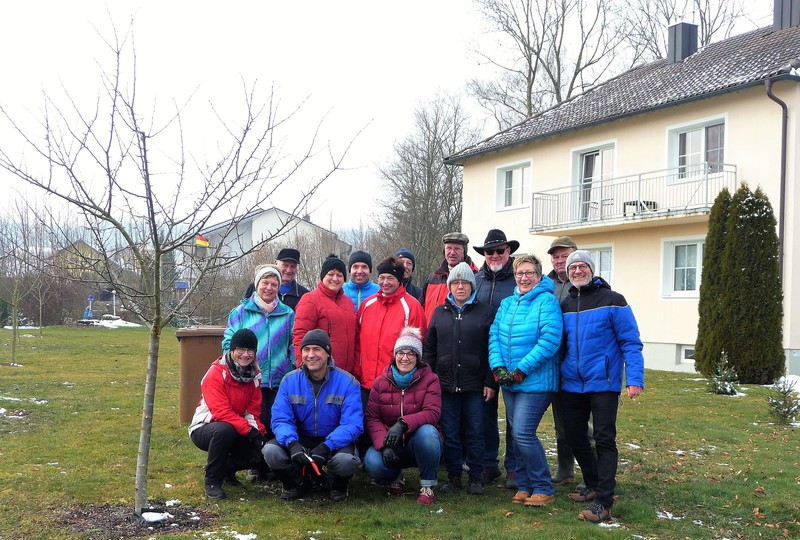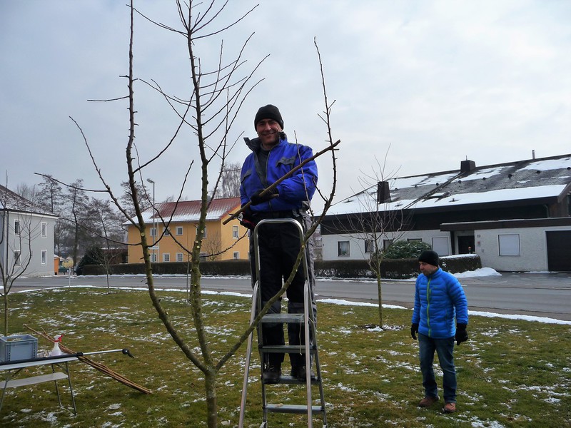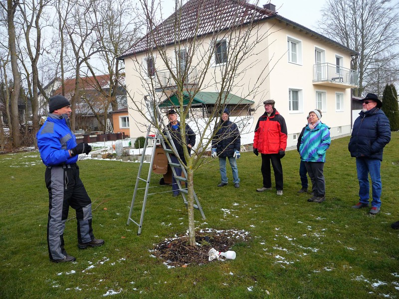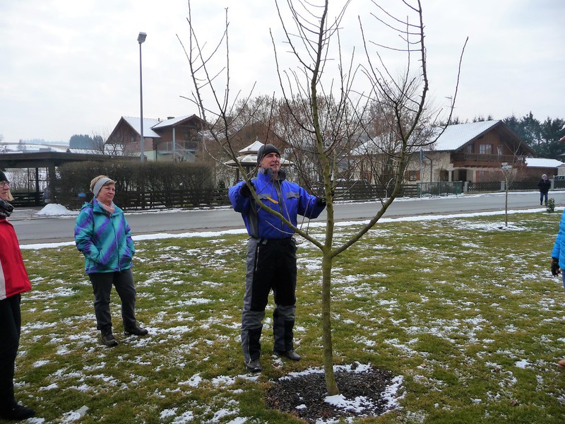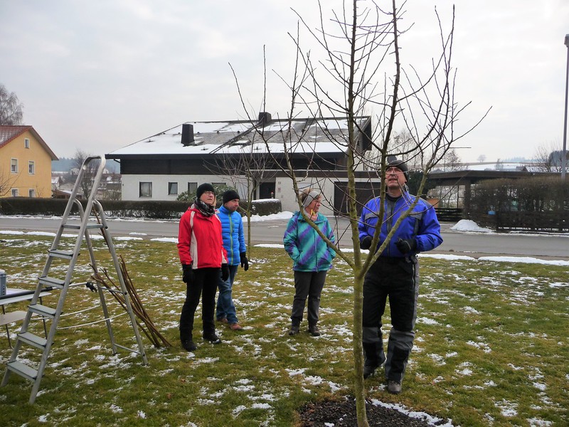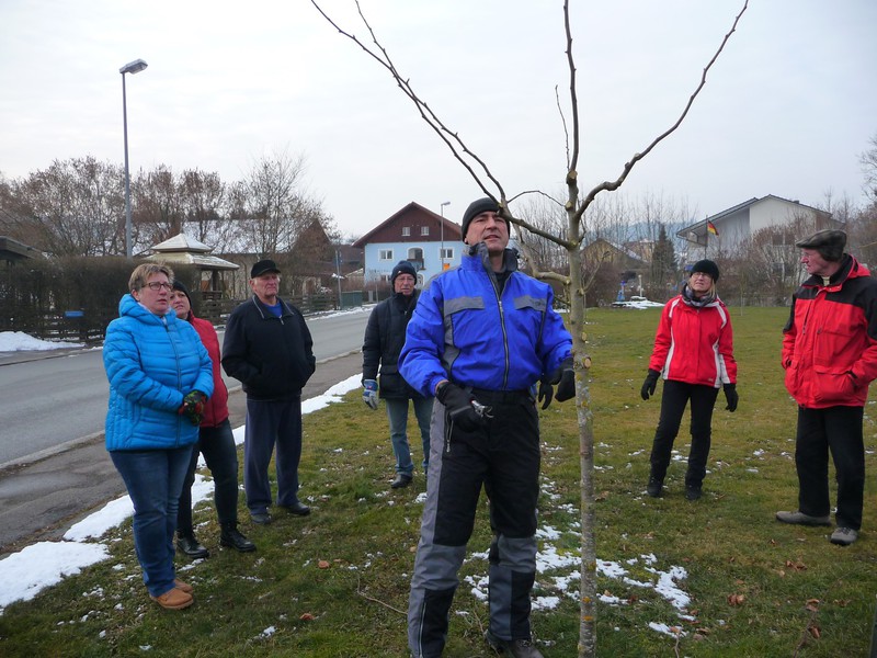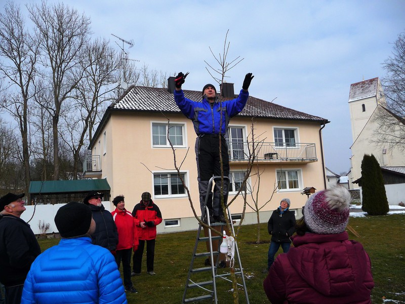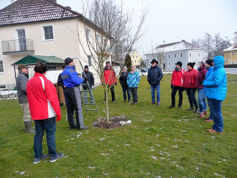 Unter der fachmännischen Anleitung von Hans Schwarzbauer wurde an den Obstbäumen im Parrgarten ein weiterer Erziehungschnitt vorgenommen, um das junge Gehöhlz in Form zu bringen.