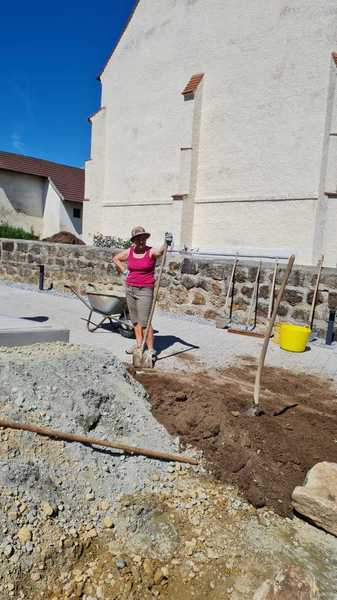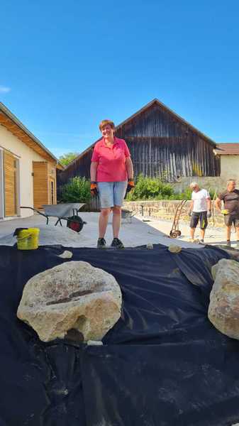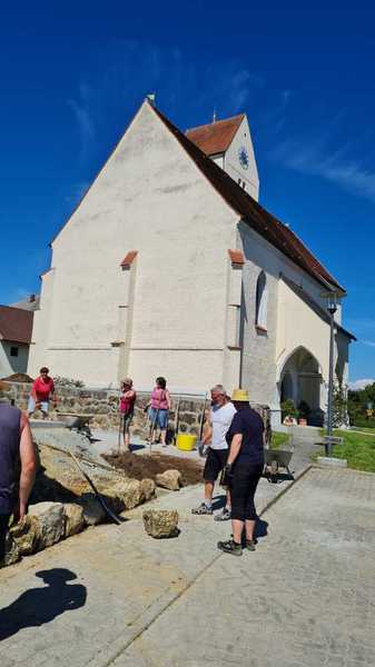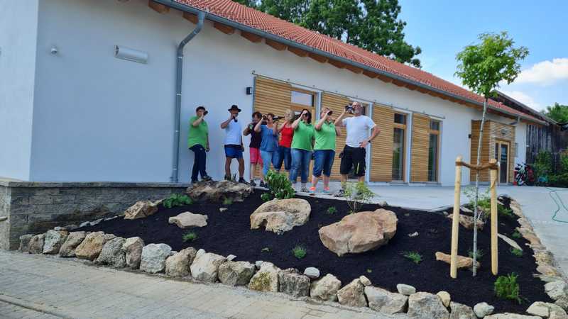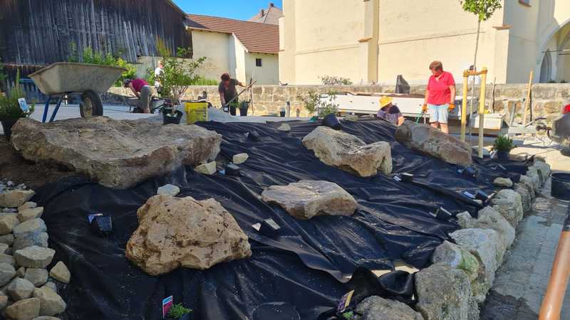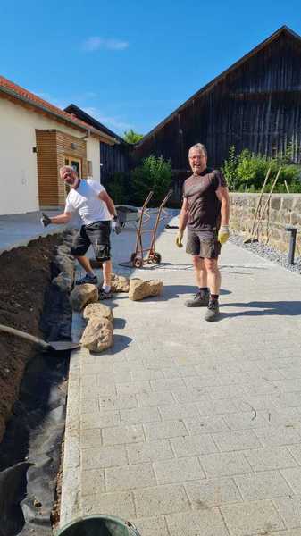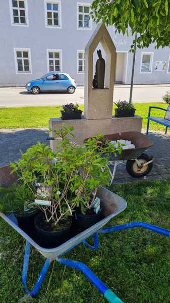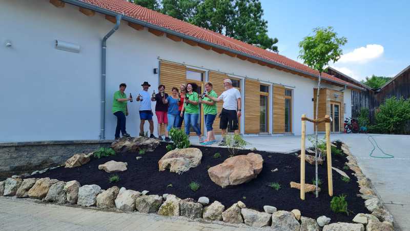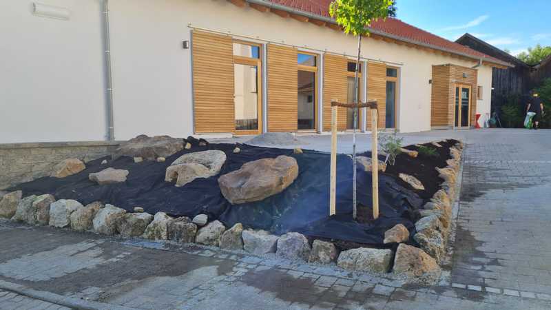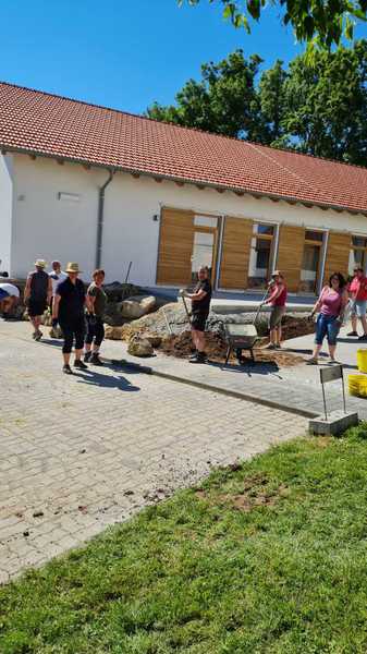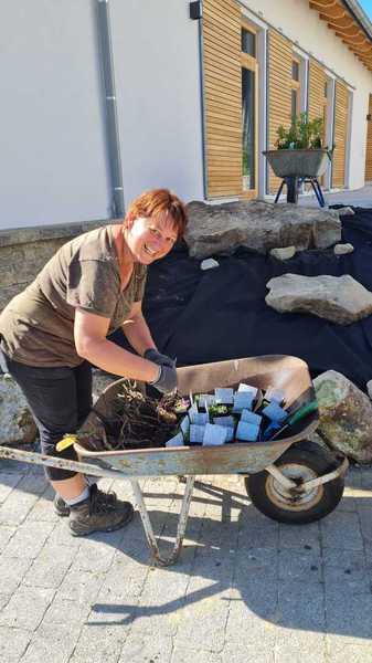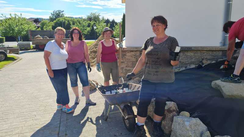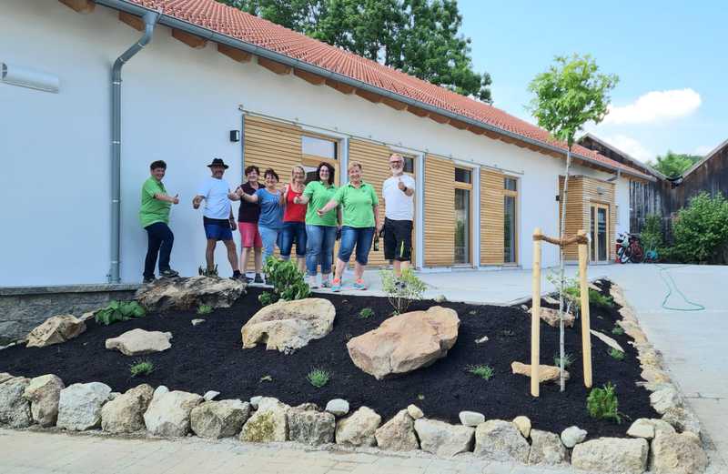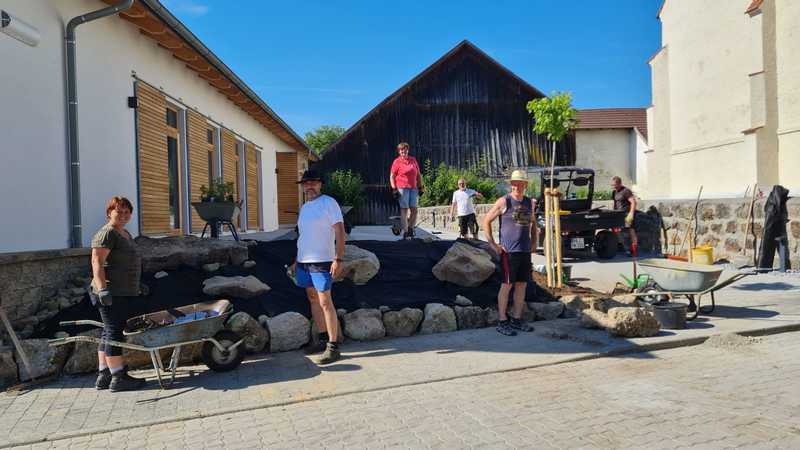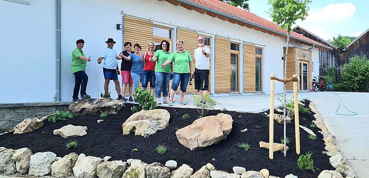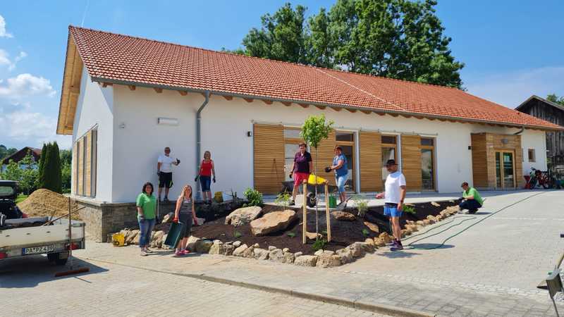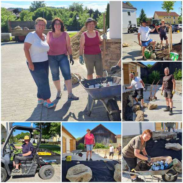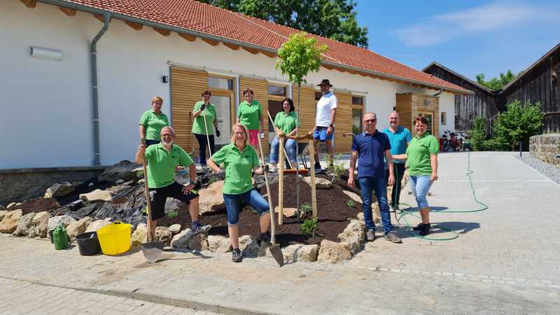 Der Gartenbauverein Reutern hat die Außenanlage am neunen Dorfgemeinschaftshaus gestaltet. Die Kosten dafür hat der Vereingetragen. Viele Mitglieder sind mit teils schweren Geräten angerückt, um die Pflanzarbeiten auszuführen zu können. Mit Findlingen wurden die Beete eingesäumt. Die schönsten Steine wurden dabei sorgfältig in die Beete eingefügt. Unter der Regie von Martina Stirner fanden alle Pflanzen ihren Platz, die sie mit zwei weiteren Vorstandskolleginen akribisch ausgewählt hatten. Ein weiteres Muss war die Pflanung eines DGH-Baums. Es waren einigen Abstimmungsrunde erforderlich, bis man sich auf eine Baumart einigen konnte. Schließlich viel die Entscheidung auf einen Amber-Kugelbaum, " Liquidambar styraciflua Gumbal", der nun den Zugang zum Dorfgemeinschatshaus ziert. Eine große Überraschung kam von der Freiwilligen Feuerwehr Reutern, vertreten durch den 1. Vorstand Hans Lindner: Den Baum zahlt die Feuerwehr Reutern! Die Pflanzung des Amberbaus übernahm Hans Linder mit Hans Schwarzbauer, in die tiefgründig vorbereitete Pflanzgrube. Das Kollektiv taufte den Baum somit gleich auf den Namen HansiBaum. Der Gartenbauverein Reuern, vertreten durch Marianne Geist bedankte sich bei allen Spender und Helfern.