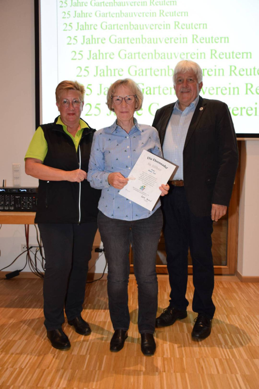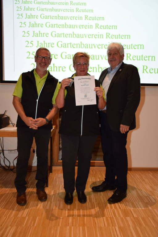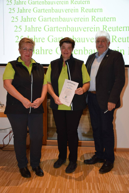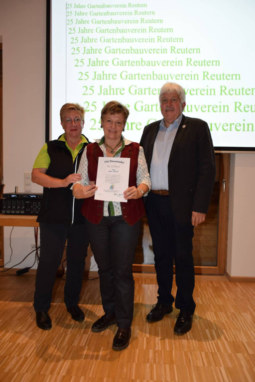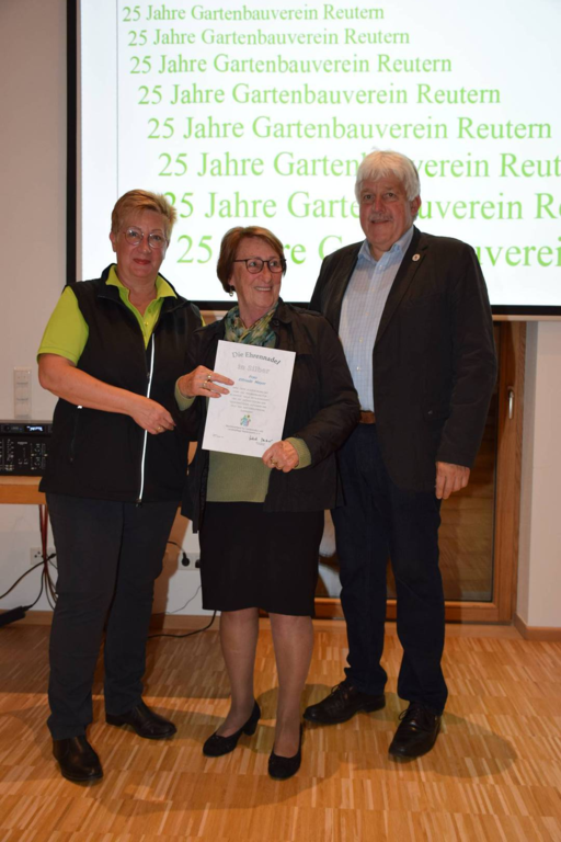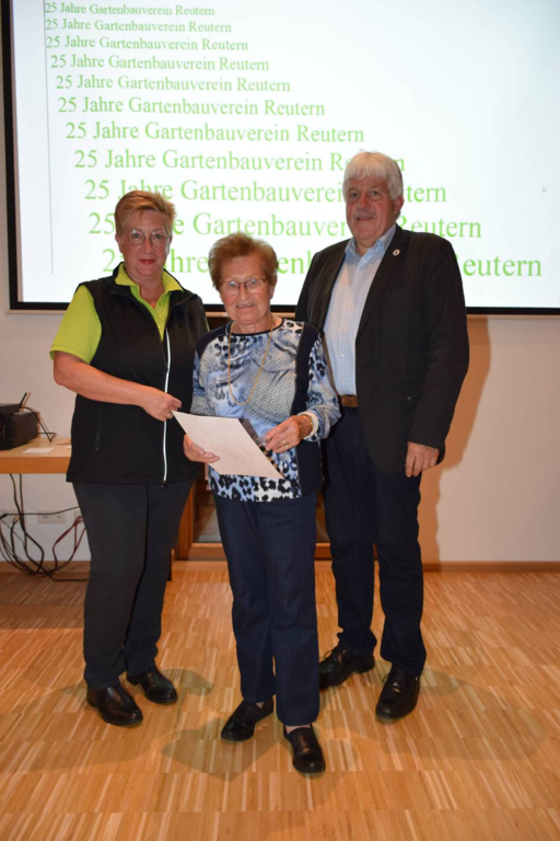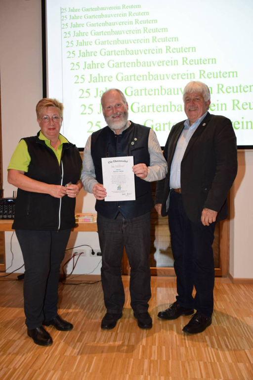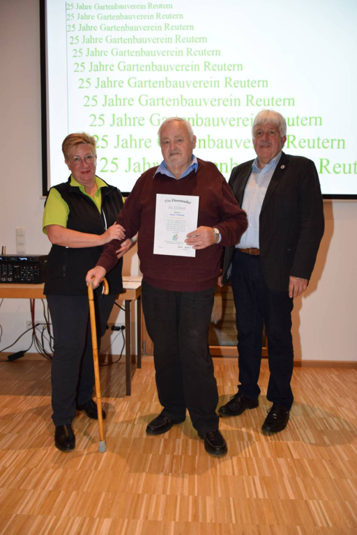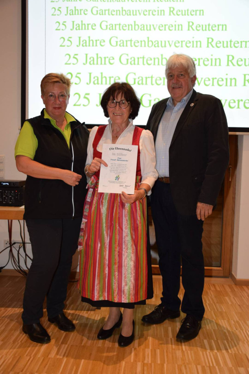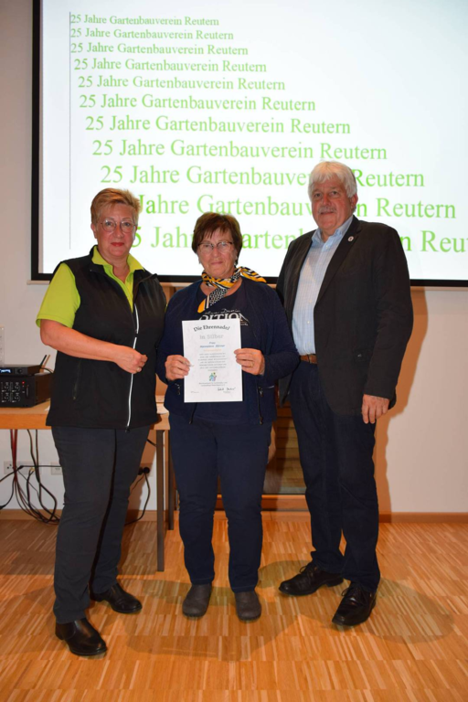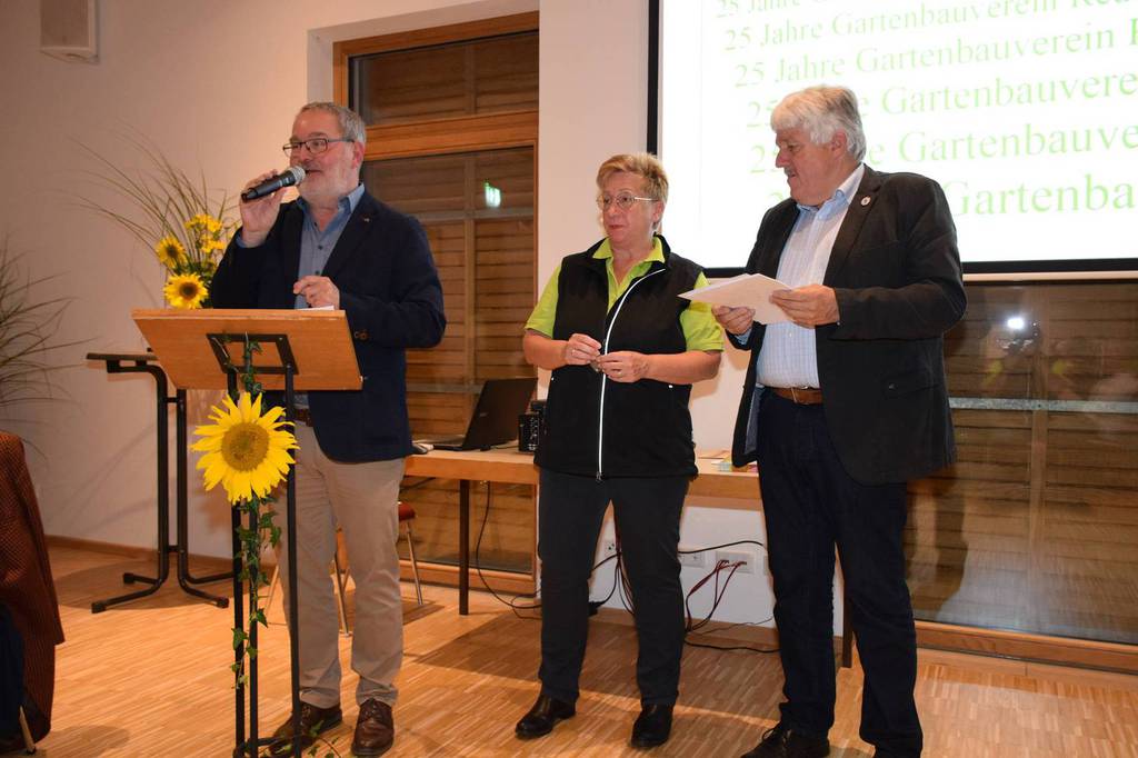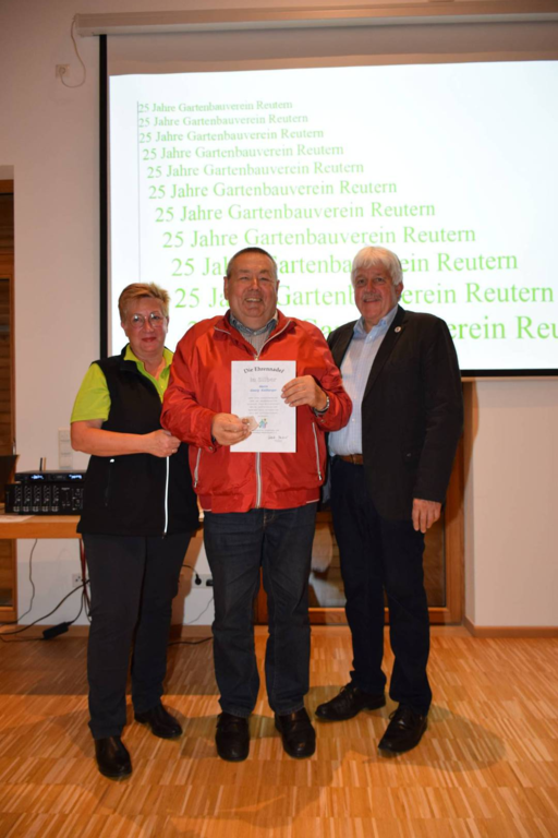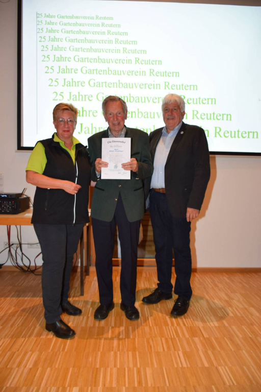 Kreisverbandsvorsitzender Josef Hirschenauer und erste Vorsitzende Marianne Geist nahmen die Mitgliederehrungen mit Moderation von Walter Karlstetter , vor. Als Gründungsmitglieder und für 25 Jahre Mitgliedschaft erhielten insgesamt 47 Personen Ehrenurkunden und Anstecknadel. Eine besondere Ehrung gab es für Helmut Bader, Franz Schwarz und Alois Gimpl, die zu Ehrenmitgliedern ernannt wurden. Alois Gimpl übernahm als Gründungsvorstand 4 Jahre den ersten Vorsitz und stand im Anschluss bis 2012 der Vorstandschaft zur Verfügung. Helmut Bader leistete 16 Jahre (14 Jahre davon als 1. Vorsitzender) wertvolle Arbeit in der Entwicklung des Vereines. Ebenso so tatkräftig stand Franz Schwarz über 16 Jahre für die Belange des Vereines in der Vorstandschaft seinen Mann. Als Dank und in Anerkennung der geleisteten Dienste erhielten sie eine Ehrenurkunde für ihr Engagement. Als süße Abrundung warteten die Gartler mit Schmalzgebackenen, Kuchen und Kaffee auf, der als Übergang in einen geselligen, lockeren Abend fungierte. Für die musikalische Umrahmung sorgte Gertrud Sterling an der Zither und Harfe begleitet von Johann Lorenz mit der Steirischen Ziehharmonika. Für die lustige Grundstimmung fand sich Traudl Wolff, die aus der wienerischen Humorscene viele Geschichten rezitierte.