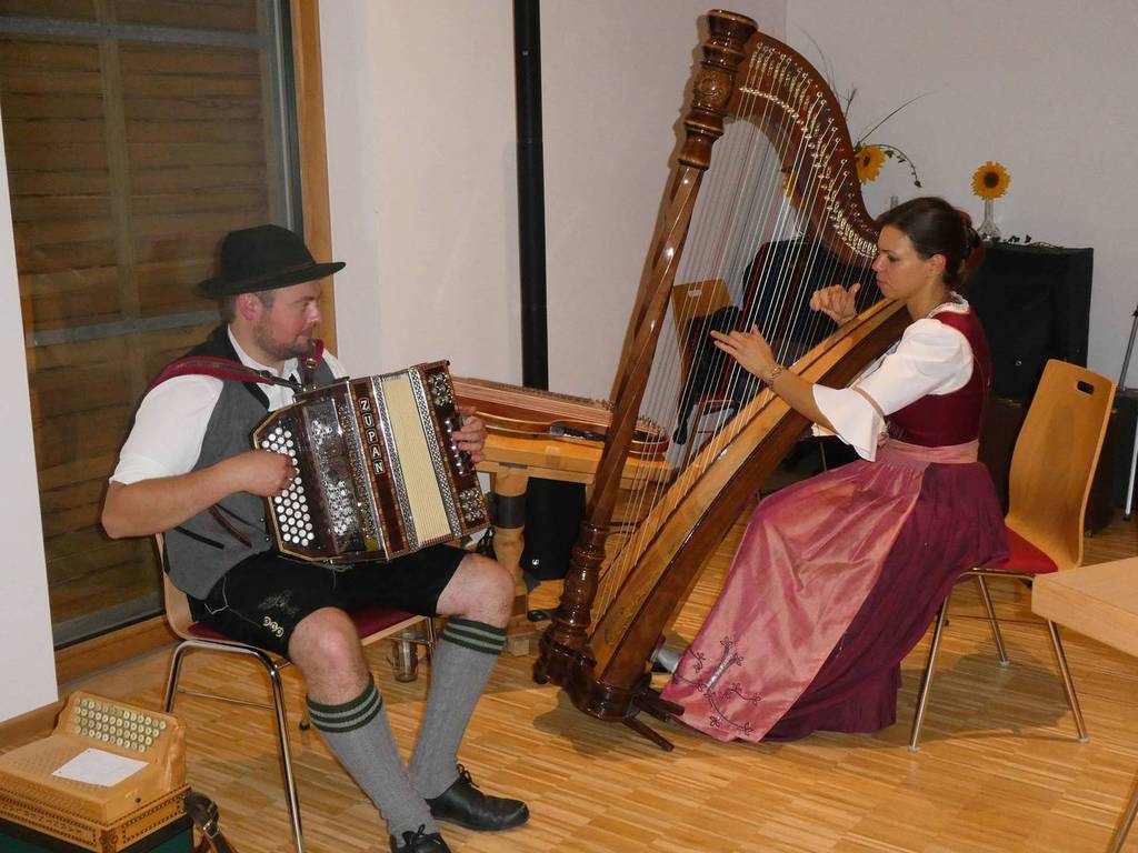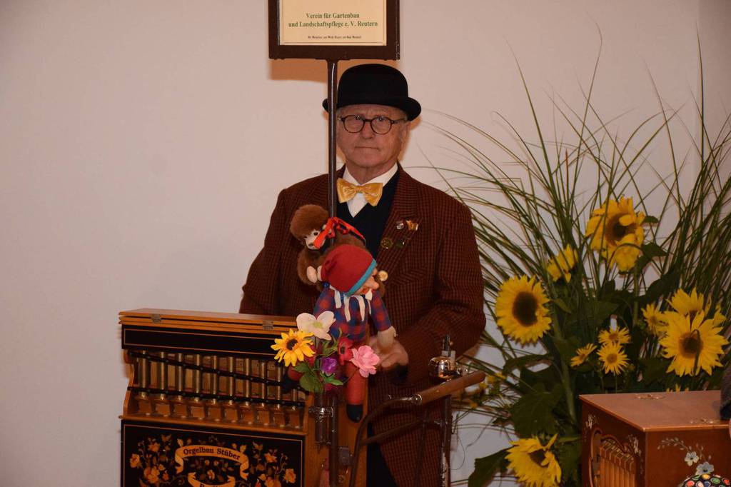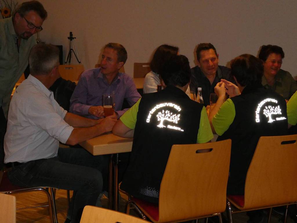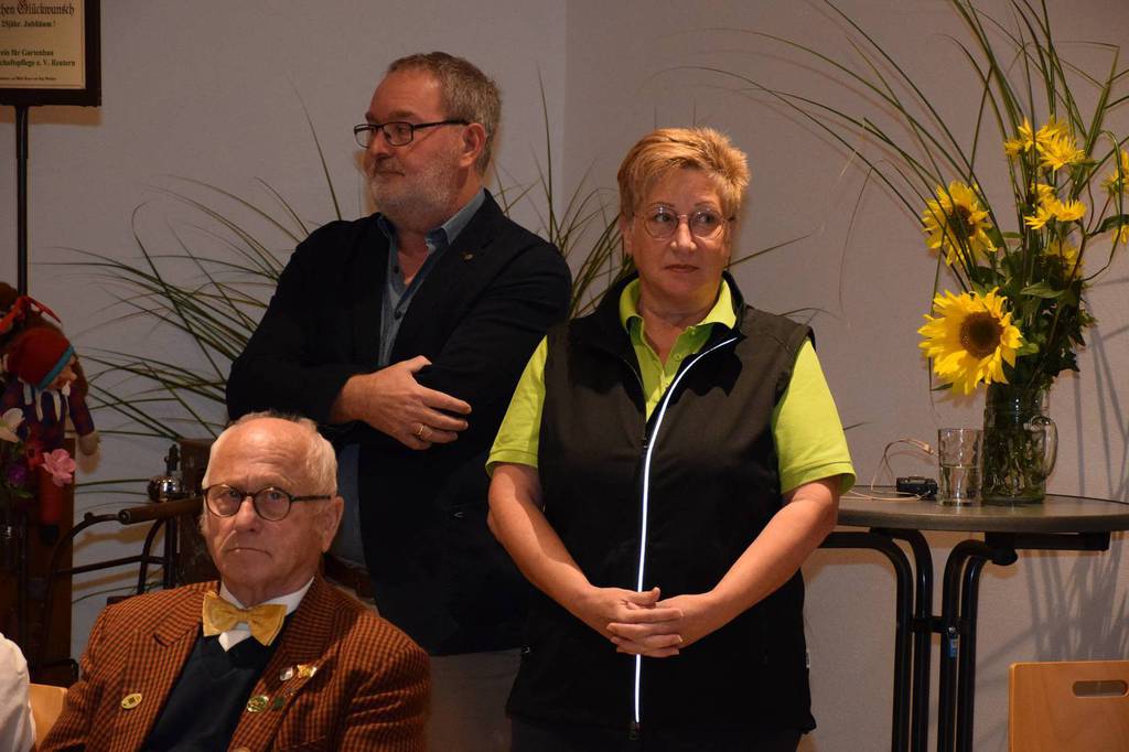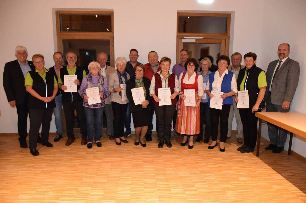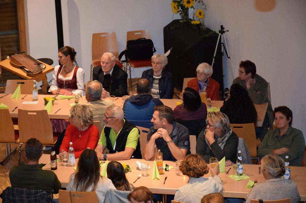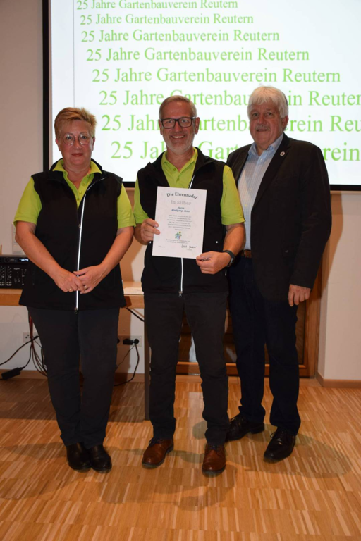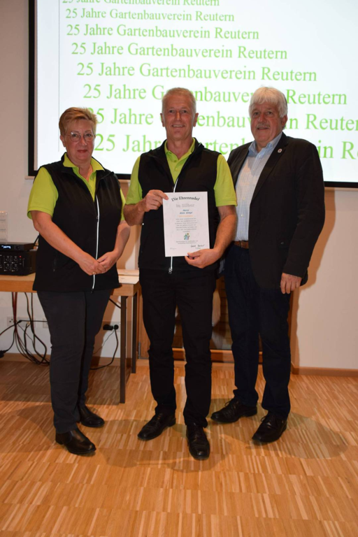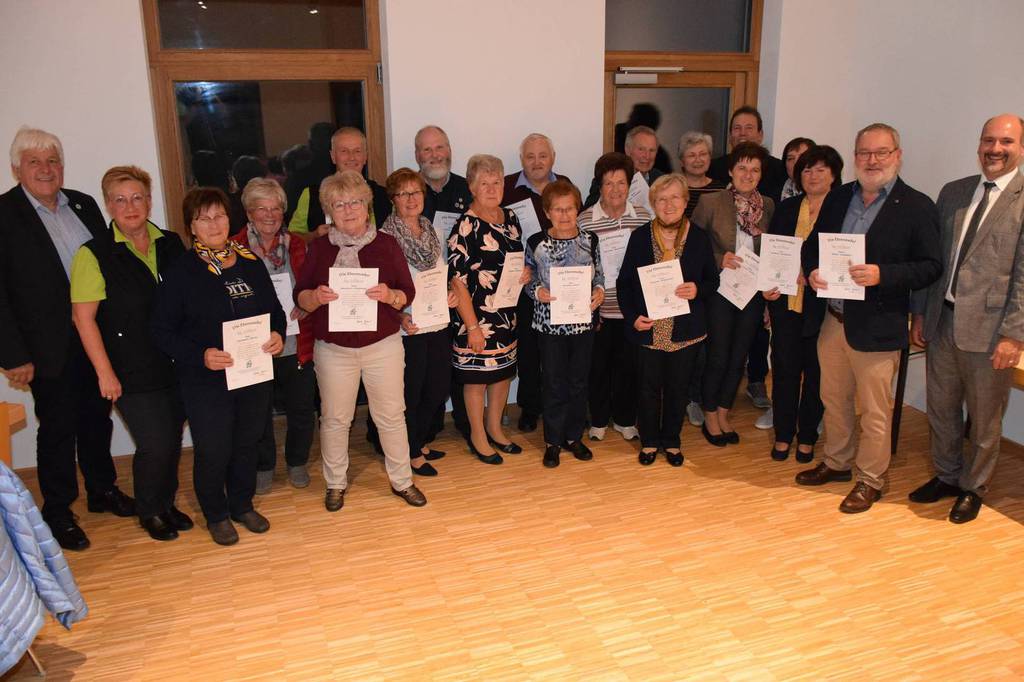 Kreisverbandsvorsitzender Josef Hirschenauer und erste Vorsitzende Marianne Geist nahmen die Mitgliederehrungen mit Moderation von Walter Karlstetter , vor. Als Gründungsmitglieder und für 25 Jahre Mitgliedschaft erhielten insgesamt 47 Personen Ehrenurkunden und Anstecknadel. Eine besondere Ehrung gab es für Helmut Bader, Franz Schwarz und Alois Gimpl, die zu Ehrenmitgliedern ernannt wurden. Alois Gimpl übernahm als Gründungsvorstand 4 Jahre den ersten Vorsitz und stand im Anschluss bis 2012 der Vorstandschaft zur Verfügung. Helmut Bader leistete 16 Jahre (14 Jahre davon als 1. Vorsitzender) wertvolle Arbeit in der Entwicklung des Vereines. Ebenso so tatkräftig stand Franz Schwarz über 16 Jahre für die Belange des Vereines in der Vorstandschaft seinen Mann. Als Dank und in Anerkennung der geleisteten Dienste erhielten sie eine Ehrenurkunde für ihr Engagement. Als süße Abrundung warteten die Gartler mit Schmalzgebackenen, Kuchen und Kaffee auf, der als Übergang in einen geselligen, lockeren Abend fungierte. Für die musikalische Umrahmung sorgte Gertrud Sterling an der Zither und Harfe begleitet von Johann Lorenz mit der Steirischen Ziehharmonika. Für die lustige Grundstimmung fand sich Traudl Wolff, die aus der wienerischen Humorscene viele Geschichten rezitierte.